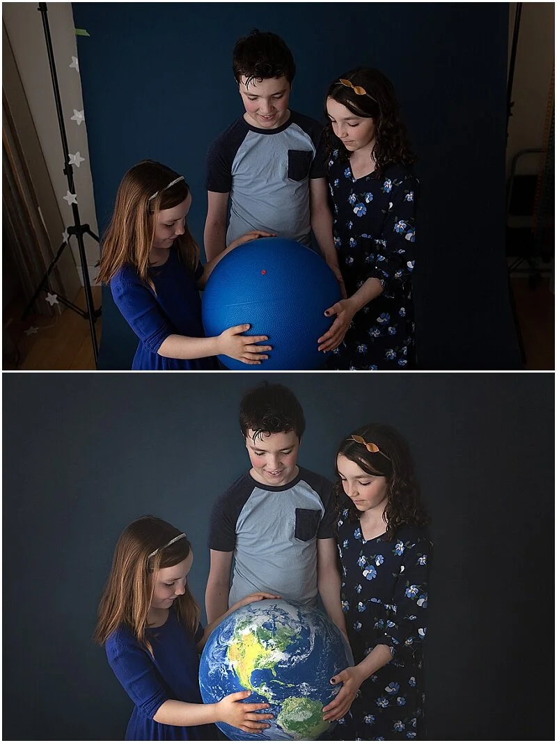 I decided that I needed to pull myself out of my funk, and planned a simple creative shoot using my own little muses. With the global state of affairs , and with Earth Day approaching, I decided to incorporate “the earth” into my images. As you can see … much of the image was created in Photoshop. You may laugh at my “before” images, but I didn’t have much to work with in terms of “props.” I needed something to mimic the world, and so I used what I had on hand (which ended up being my daughter’s bounce-on ball and ….a turnip! LOL) … And then I used the magic of Photoshop to bring my vision to life!